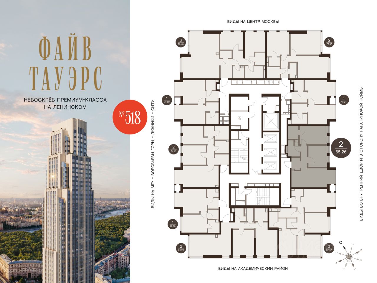 ФАЙВ ТАУЭРС — первый жилой небоскрёб на Ленинском проспекте и самый высокий дом столицы за пределами делового кластера "Москва-Сити". Премиальный небоскрёб представляет собой ультрасовременное, высокотехнологичное здание, идеальный синтез стилей культовых высоток Москвы и небоскребов Нью-Йорка и поражает воображение уникальными видами, монументальной роскошью и совершенством форм. Величественная панорама, открывающаяся из окон вашей квартиры, завораживает: легендарные сталинские высотки, шпиль главного корпуса МГУ, "Москва-Сити", спорткомплекс "Лужники".