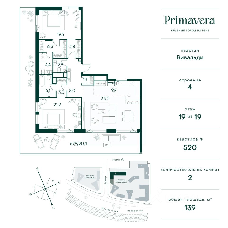 Клубный город на реке Primavera — это респектабельный проект премиум-класса на первой береговой линии Москвы-реки в экологически безупречном районе — Покровское-Стрешнево. Под панорамными окнами квартир расположился собственный экопарк, площадью 12 гектаров с сетью прогулочных дорожек, оборудованный детскими и спортивными площадками, а за ним набережная с собственным пляжем и зонами отдыха. Клубный город на реке Primavera предлагает впечатляющий выбор планировок для любого жизненного сценария: от просторных однокомнатных квартир до пентхаусов и квартир с видовыми террасами или патио. Выбирайте из 120 вариантов эргономичных планировок стандартного и евроформата. В проекте доступны квартиры площадью от 40 до 209 м², в каждой из которых открываются непревзойденные виды на реку, а угол обзора составляет 270 градусов. Из дизайнерских лобби открывается панорамный обзор на зеленый благоустроенный двор. Статусное мебелирование, потолки высотой 6 м и комфортная лаунж-зона отсылают к стилистике высококлассных пятизвездочных отелей. В Primavera есть все, что может предложить мегаполис, здесь все сосредоточено вокруг вас и настроено на ваши желания: - Всестороннее детское развитие в паре шагов от дома: 4 школы, 8 детских садов, развивающие центры с кружками и секциями. - Комфорт мегаполиса на расстоянии приятной прогулки: супермаркеты, кафе, рестораны с верандами на крыше, салоны красоты, аптеки, компании сферы услуг, многофункциональный центр для шоппинга и развлечений. - Умный дом: автоматизированное бесконтактное управление основными системами доступа, инфраструктуры и безопасности через мобильное приложение и специальные метки. Клубный город на реке Primavera выгодно отличается близостью к природе, совмещенной с насыщенной инфраструктурой.