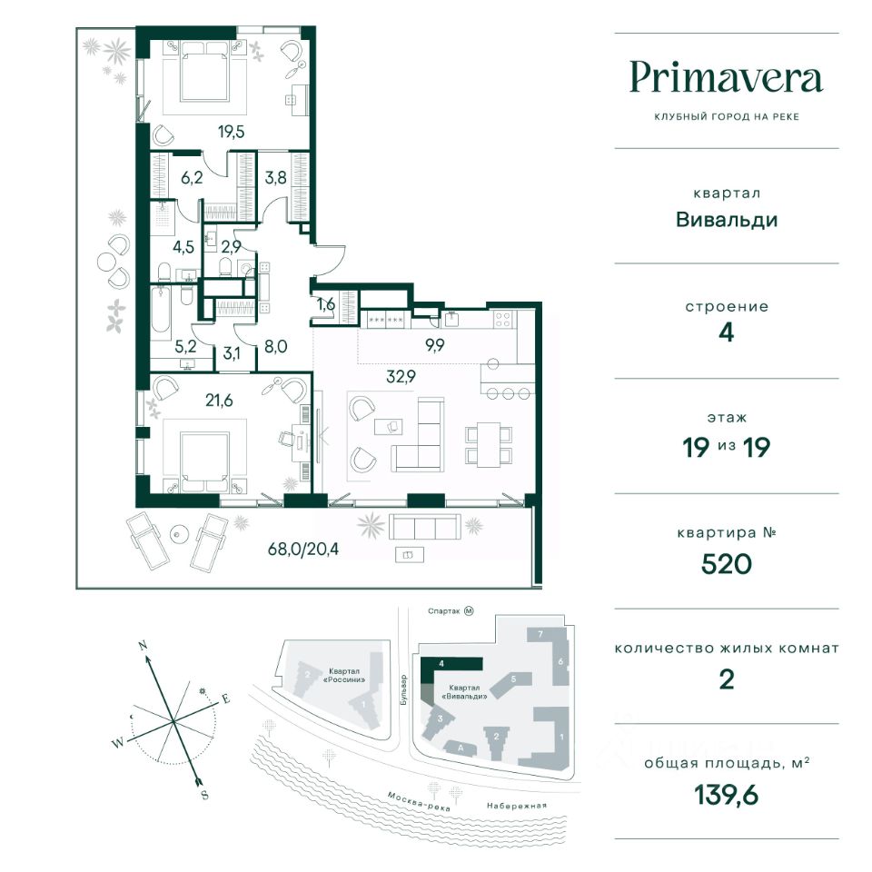 Клубный город на реке Primavera — это современный жилой комплекс премиум-класса, расположенный на первой береговой линии Москвы-реки в экологически чистом районе Покровское-Стрешнево. Под панорамными окнами квартир находится собственный экопарк с продуманной сетью прогулочных дорожек и современными детскими и спортивными площадками. За парком расположена набережная с собственным пляжем и зонами для отдыха. Клубный город на реке Primavera предлагает широкий выбор планировок для различных жизненных сценариев: от просторных однокомнатных квартир до пентхаусов и жилых помещений с террасами и патио. Выберите из 120 вариантов эргономичных планировок стандартного и евроформата. Из каждой квартиры открываются красивые виды на реку с углом обзора в 270 градусов. Дизайнерские лобби предлагают панорамный обзор на благоустроенный двор. Высокие потолки в 6 метров и качественная отделка создают атмосферу, схожую с пятизвездочными отелями. В Primavera есть всё необходимое для комфортной жизни в мегаполисе: • Образование для детей в шаговой доступности: 4 школы, 8 детских садов и развивающие центры с кружками и секциями. • Удобства на расстоянии приятной прогулки: супермаркеты, кафе, рестораны с верандами, салоны красоты, аптеки и многофункциональный центр для шоппинга и развлечений. • Умный дом: автоматизированное бесконтактное управление основными системами доступа и безопасности через мобильное приложение. Клубный город на реке Primavera выгодно сочетает комфорт городской жизни с близостью к природе. Живите в месте, где все создано для вашего удобства!