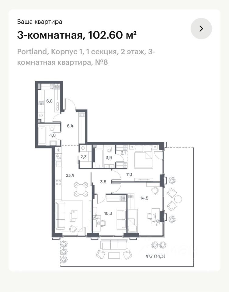 Продам квартиру с большой террасой и видом на реку. Сдача дома в 2025 году.