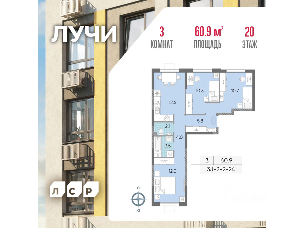 Продается 3-комнатная квартира общей площадью 60.9 кв. метров на 20 этаже жилого комплекса Лучи.
