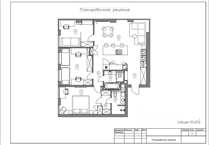 Квартира формата 4Е (кухня-гостиная + 3 жилых комнаты) площадью 97.2м2.
