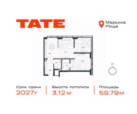 Продается 2-комнатная квартира от застройщика в ЖК премиум-класса TATE на 28 этаже. Общая площадь 59,79 м². Отделка предчистовая (white box). 2 санузла. Вид из окна на Парк Сокольники, ВДНХ/Парк Останкино. Угловое остекление. Мастер-спальня. Башня A.