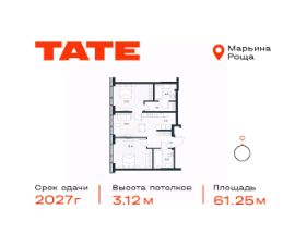 Продается 2-комнатная квартира от застройщика в ЖК премиум-класса TATE на 28 этаже. Общая площадь 61,25 м². Отделка предчистовая (white box). 2 санузла. Вид из окна на Тимирязевский парк. Мастер-спальня. Мастер-спальня с гардеробной. Башня A.