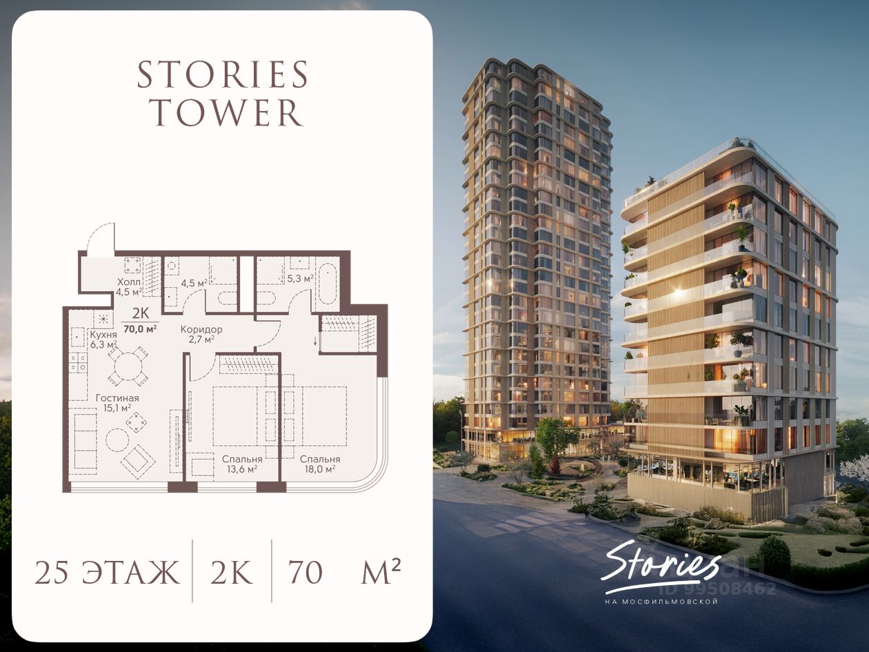 Уникальная возможность в Stories на Мосфильмовской! Проект может быть введен в эксплуатацию в ближайшее время, уже начало работу приемная комиссия. Скидка до 16% на эксклюзивный остаток квартир в проекте бизнес-класса с опциями премиум в престижном районе Раменки. Удобное расположение: 2 мин. пешком до м. Аминьевская, 15 мин. на машине до Нового Арбата, удобный выезд на проспект Генерала Дорохова, продлили ул. Мосфильмовская. В окружении парков и скверов: долина реки Сетунь, устье Раменки, сад Довженко и парк "Событие". В пользовании жителей - эксплуатируемая кровля с большой террасой и уютный двор-патио с интересной геопластикой, а также все атрибуты высокого класса: просторное дизайнерское лобби с каминами, уютными зонами отдыха, библиотекой и coffee point. В проекте откроется детский клуб с авторской методикой развития 10 видов интеллекта OCTOBER SMART KIDS в партнерстве с международной сетью "Беби-клуб".