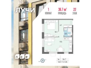 Продается 1-комнатная квартира общей площадью 36.7 кв. метров на 22 этаже жилого комплекса Лучи.