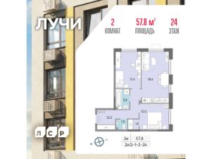 Продается 2-комнатная квартира общей площадью 57.8 кв. метров на 24 этаже жилого комплекса Лучи.