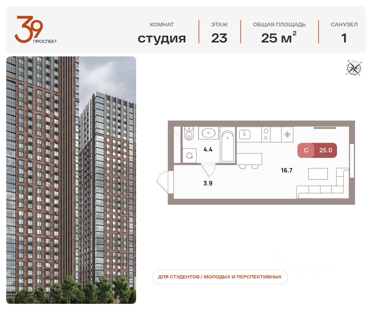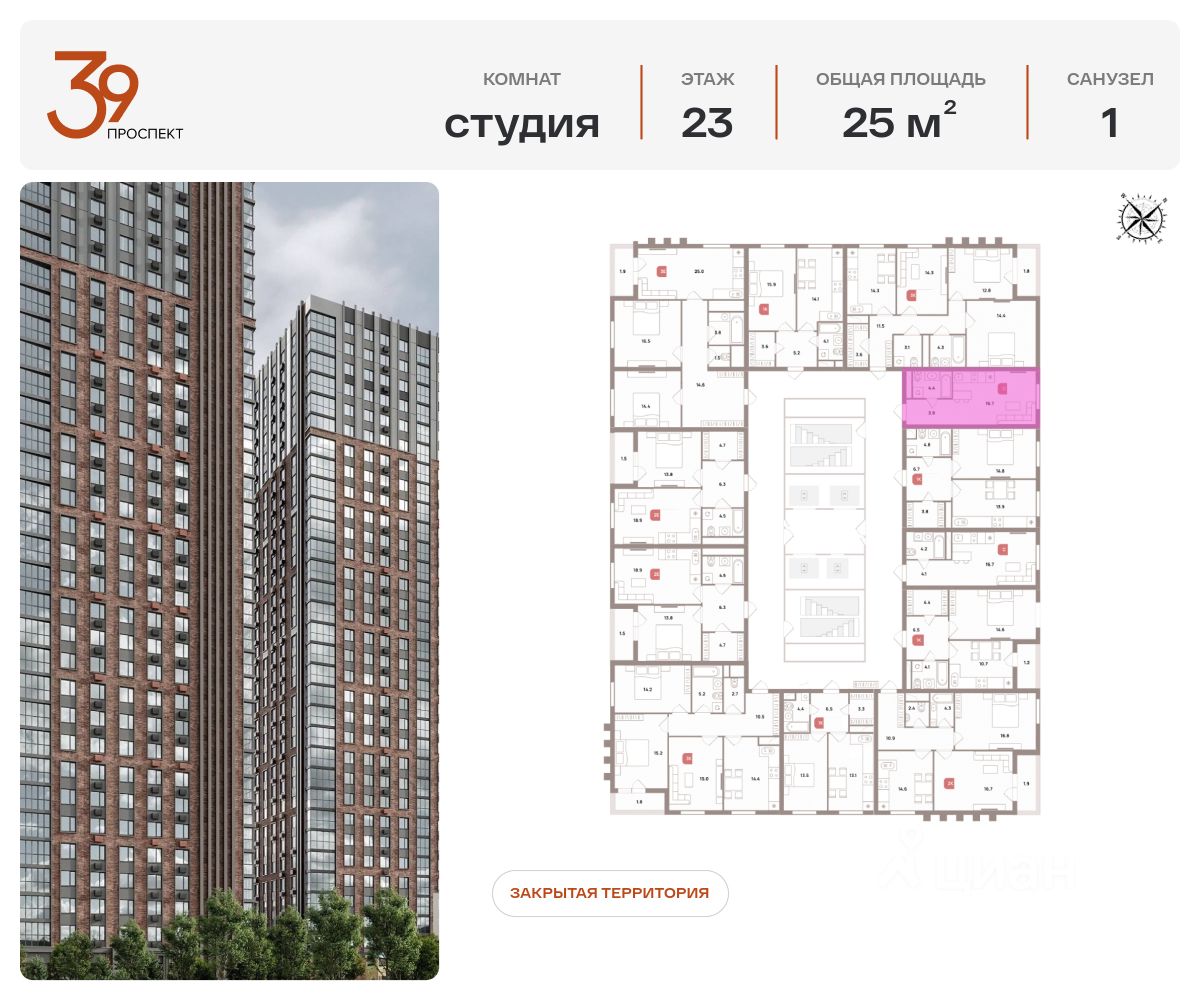 Продается многокомнатная квартира в ЖК "Проспект 39" по адресу Москва, ЮВАО, Рязанский проспект, вл. 39, к. 1. Общая площадь квартиры - 25,00 кв.м., этаж 23. Стоимость квартиры - 11 573 650 р. Продаётся без отделки.