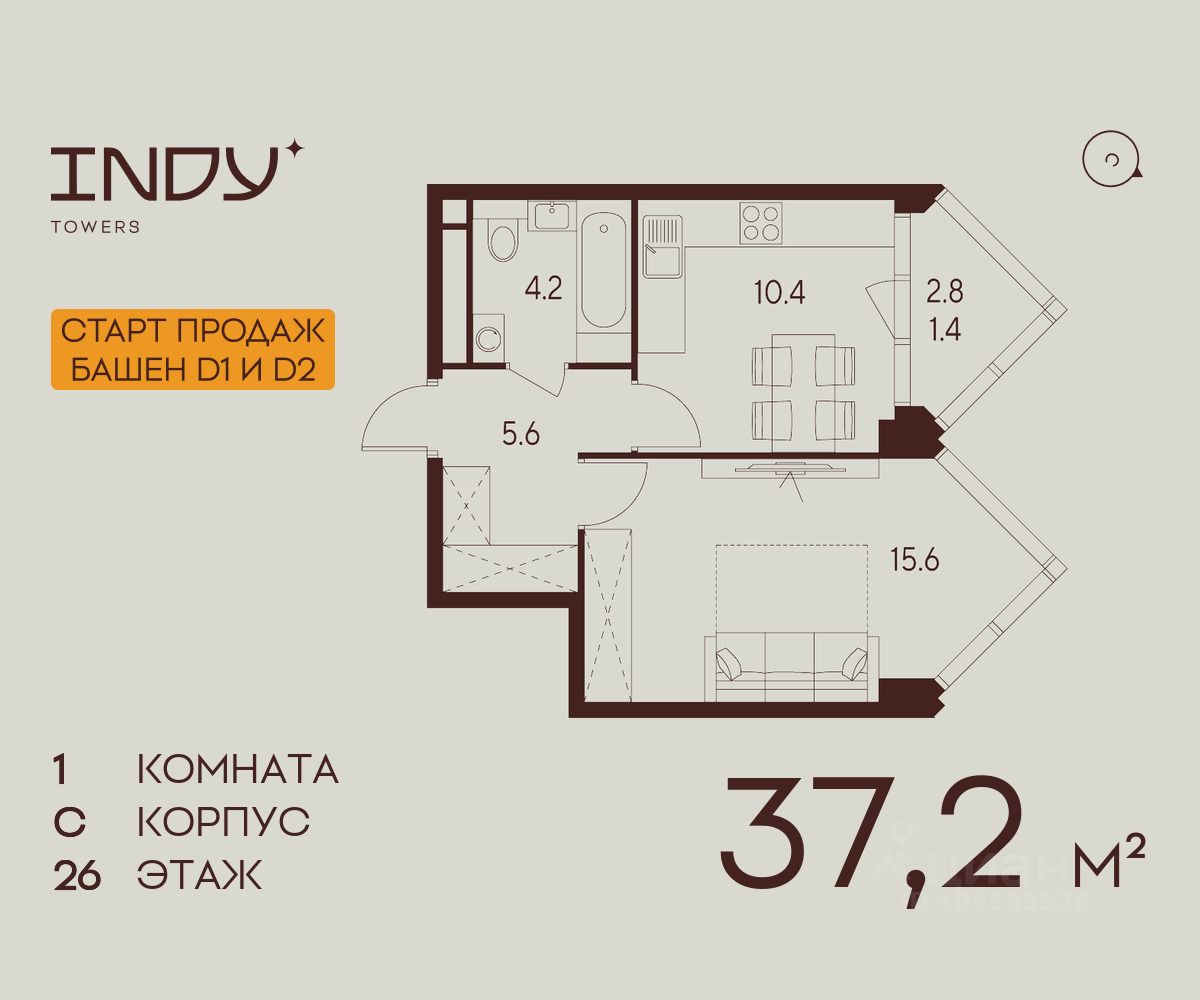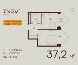 Продается уютная однокомнатная квартира на 26 этаже жилого комплекса Indy Towers. Вид из окон: на улицу. Срок сдачи: 4 кв. 2026 г.