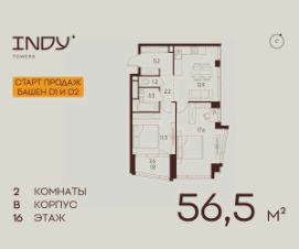 Продается 2-комнатная квартира на 16 этаже жилого комплекса Indy Towers. Вид из окон: во двор. Срок сдачи: 4 кв. 2026 г.