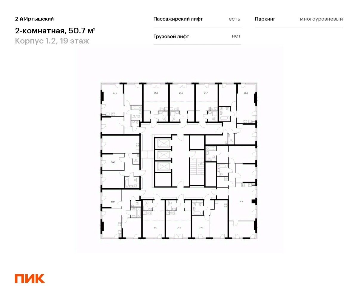 Продаётся 2-комн. квартира площадью 50,7 кв.м на 19 этаже 19 этажного дома (Корпус 1.2, Секция 2) проекта ПИК 2-й Иртышский. Светлый просторный подъезд на уровне земли, функциональная планировка, большие окна, c отделкой.