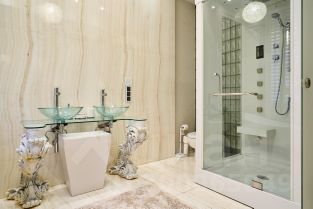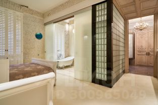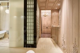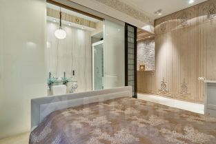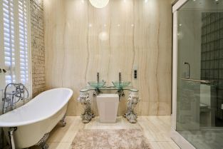 Мастер-спальня выполнена в светлых тонах с сохранением первозданной лепнины. Многие вещи и мебель создавались под заказ по эскизам автора проекта из натурального дерева .Этот материал добавляет уюта.В хозяйском санузле разместили островную ванну и душевую кабину. В отделке использовался натуральный камень Оникс. Зонированием послужила стеклянная раздвижная перегородка.