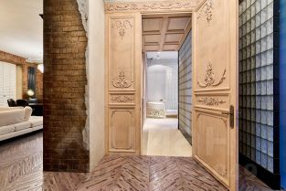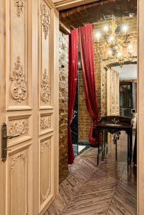 Вся мебель в интерьере довольно эклектична, но это создает ощущение дома с историей. На полу натуральное дерево с красивой фактурой. Двери в комнатах изготовлены из массива ценных пород дерева.