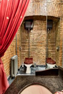 В гостевом санузле скомбинировали разные виды материала, вызывающие разные ощущения: мрамор роскошь, кирпич холод. Тяжелые бархатные портьеры отлично сочетаются с неотделанным кирпичом и чугунными батареями, делая дизайн более мягким.
