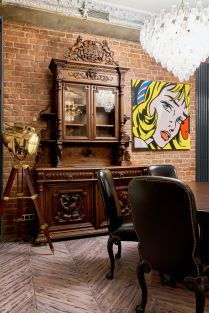 Обеденную зону украшает хрустальная люстра, которая смотрится очень изысканно. Буфет начала ХХ века, круглый обеденный стол на шесть персон. Ярким акцентом в зоне столовой служит авторская копия картины Роя Лихтенштейна.