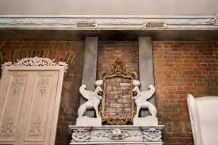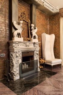 Украшением в гостиной служит настоящий дровяной камин. Старинные предметы интерьера и раритетная мебель становятся гармоничным и необычным оформлением интерьера.