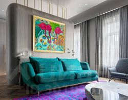ДЛЯ ОТДЫХА И РЕЛАКСА: респектабельный дизайн, спокойный интерьер с яркими деталями, выполненный из высококачественных материалов. Энергичные акценты в виде сочных цветов мебели и искрящейся позитивом картина Лейлы Кравцовой.