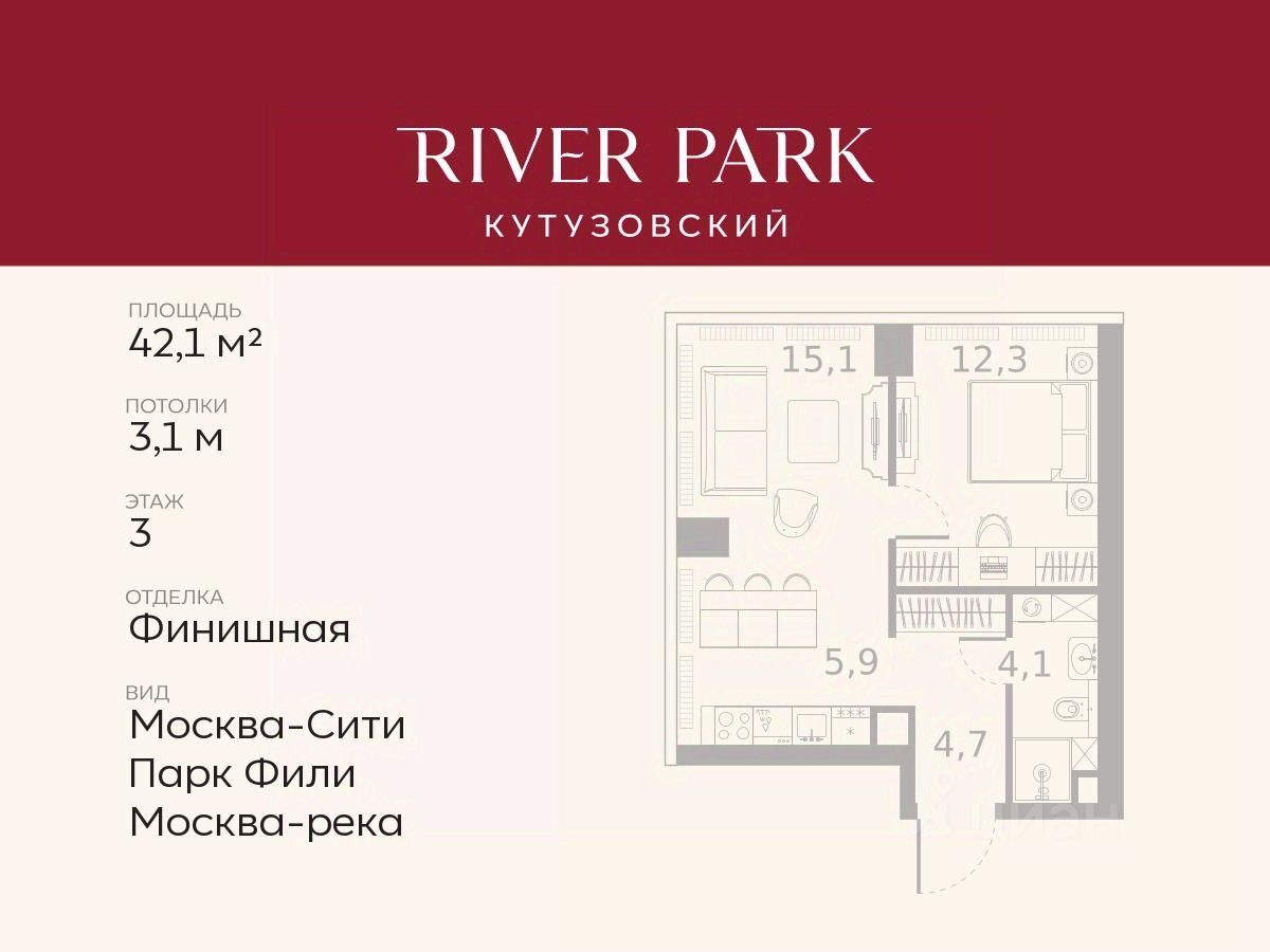Продается 1-к квартира площадью 42.1 кв.м. на 3-м этаже в жилом комплексе премиум-класса River Park Кутузовский в Башне Topaz Tower