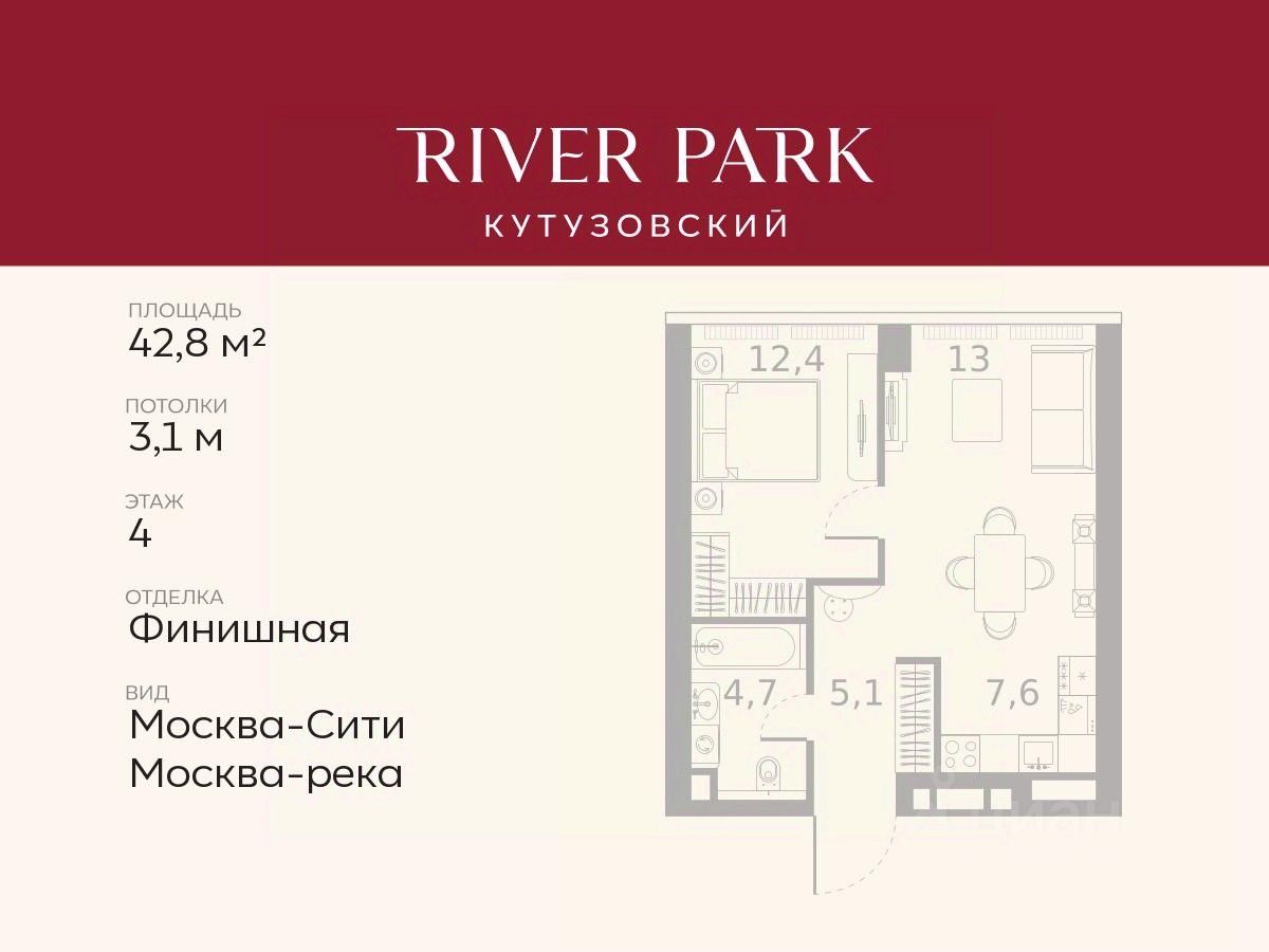 Продается 1-к квартира площадью 42.8 кв.м. на 4-м этаже в жилом комплексе премиум-класса River Park Кутузовский в Башне Topaz Tower