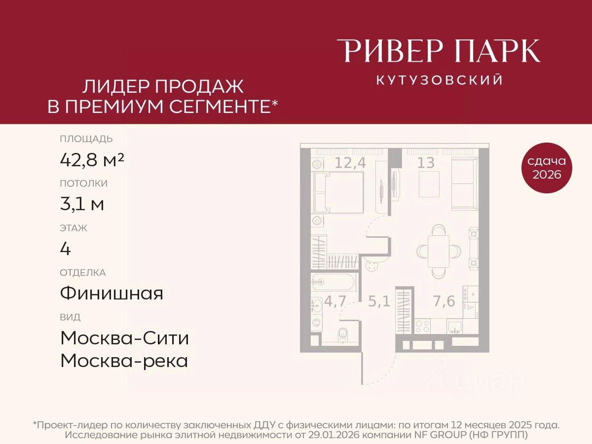 Продается 1-к квартира площадью 42.8 кв.м. на 4-м этаже в жилом комплексе премиум-класса Ривер Парк Кутузовский в Башне Топаз