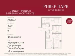 Продается 3-к квартира площадью 88.8 кв.м. на 7-м этаже в жилом комплексе премиум-класса Ривер Парк Кутузовский в Башне Топаз