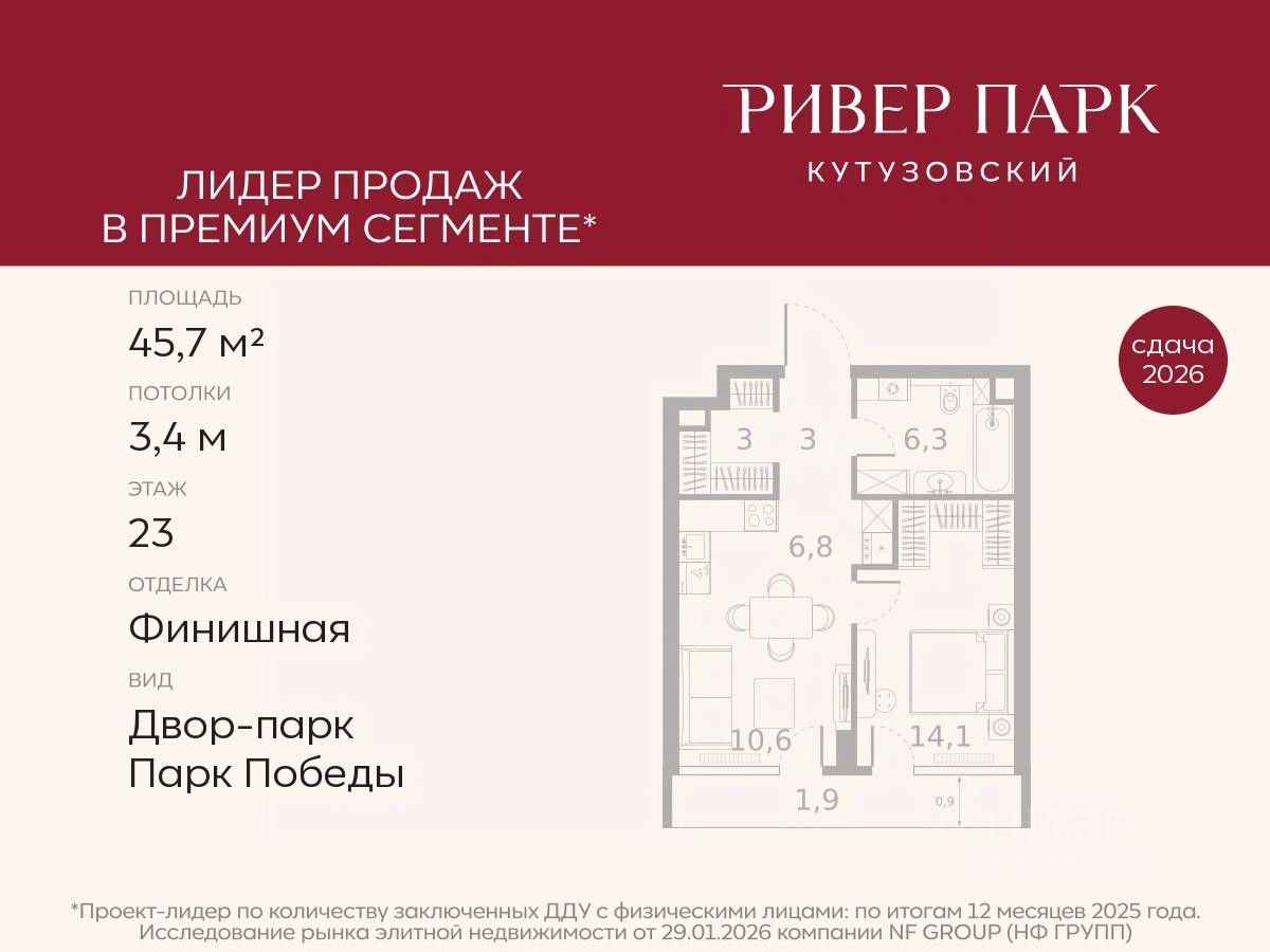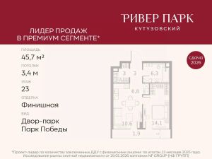 Продается 1-к квартира площадью 45.7 кв.м. на 23-м этаже в жилом комплексе премиум-класса Ривер Парк Кутузовский в Башне Топаз