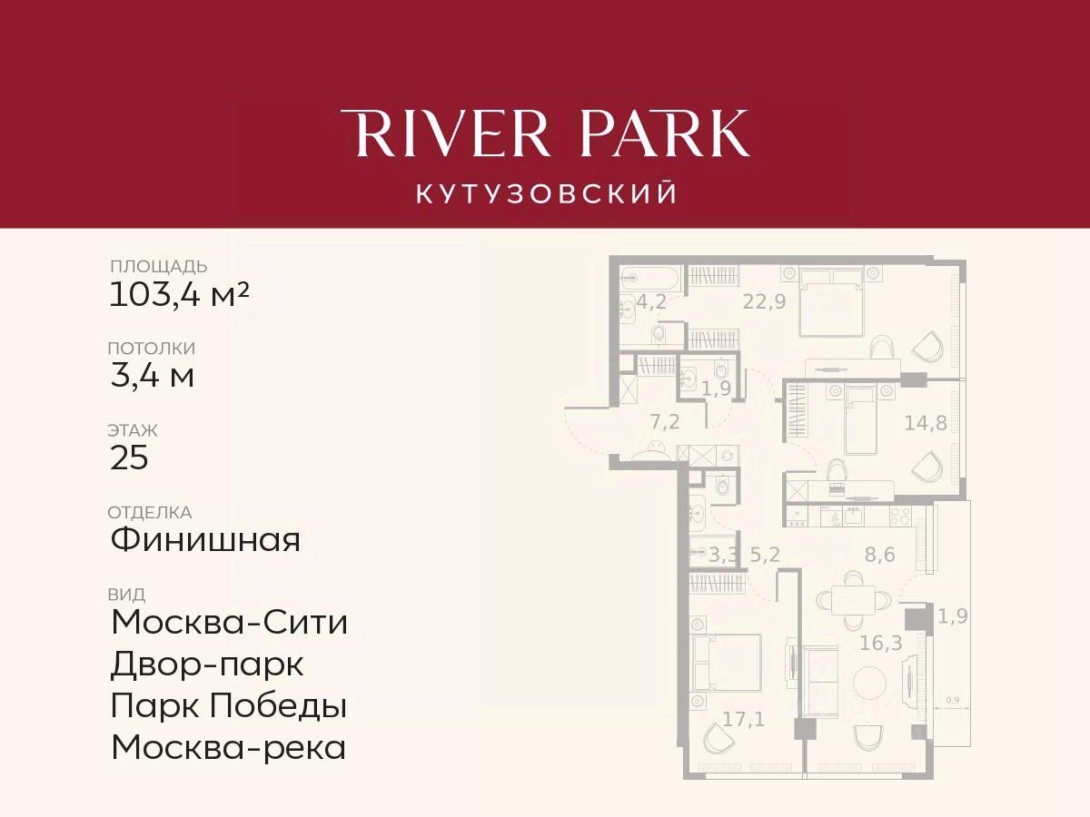 Продается 3-к квартира площадью 103.4 кв.м. на 25-м этаже в жилом комплексе премиум-класса River Park Кутузовский в Башне Topaz Tower