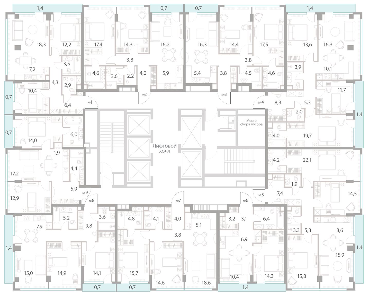 Архитектура от именитого бюро ADM отличается уникальной пластикой фасадов - башни словно парят в воздухе, играя гранями как драгоценные камни. Жилой комплекс состоит из 5-ти небоскребов с home park на закрытой территории и внешней торговой галереей с открытым доступом.