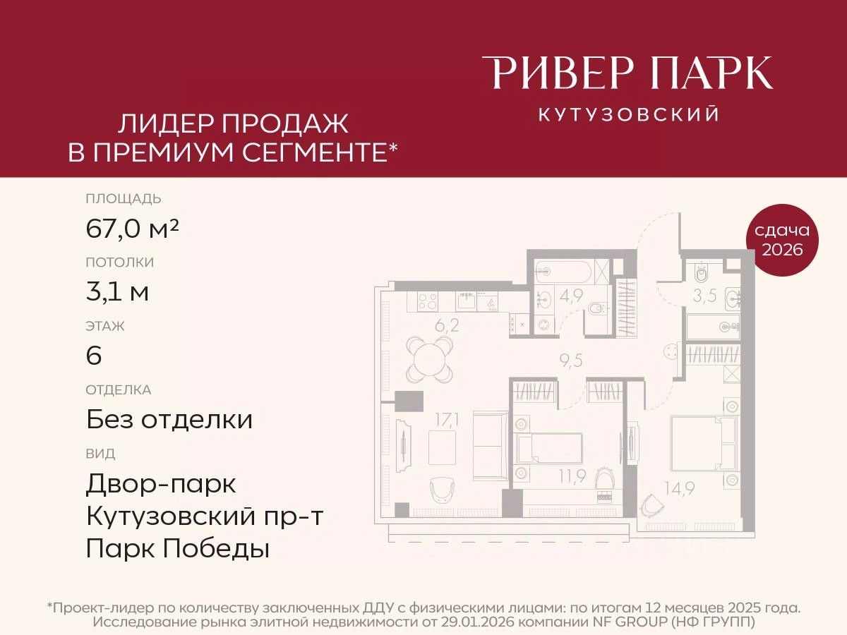 Продается 2-к квартира площадью 67.0 кв.м. на 6-м этаже в жилом комплексе премиум-класса Ривер Парк Кутузовский в Башне Янтарь