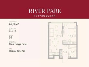 Продается 1-к квартира площадью 47.9 кв.м. на 16-м этаже в жилом комплексе премиум-класса River Park Кутузовский в Башне Amber Tower