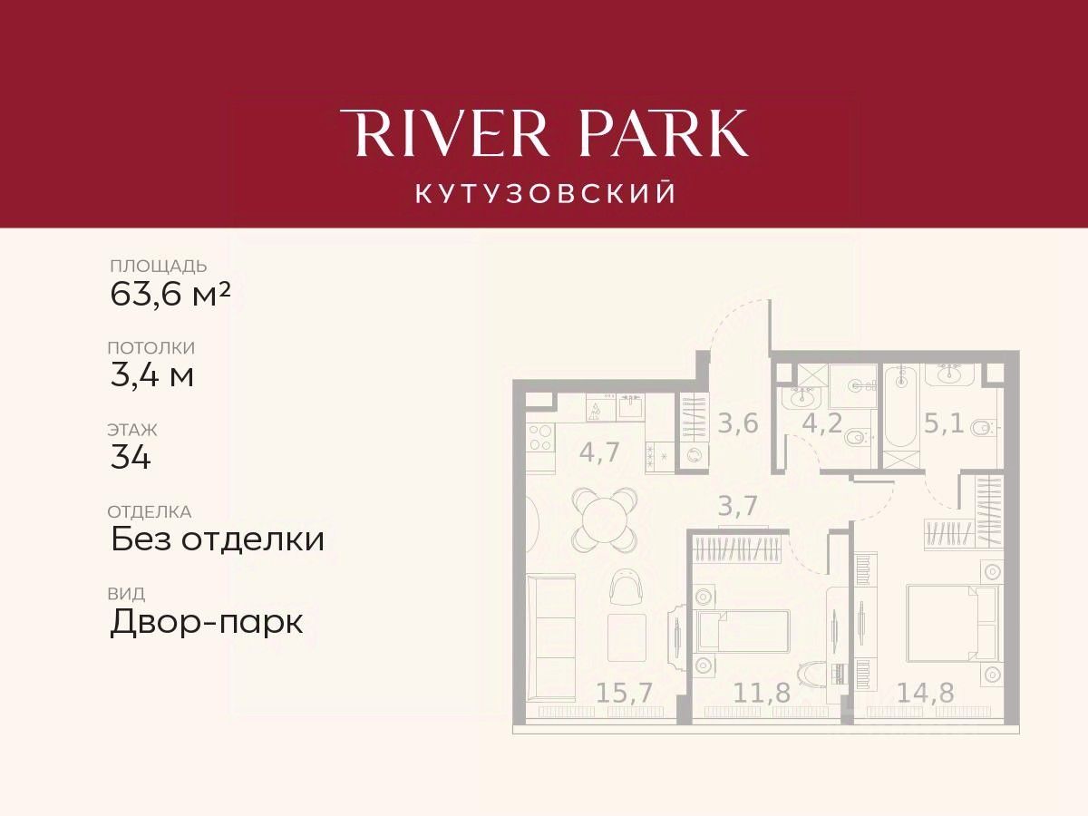 Продается 2-к квартира площадью 63.6 кв.м. на 34-м этаже в жилом комплексе премиум-класса River Park Кутузовский в Башне Amber Tower
