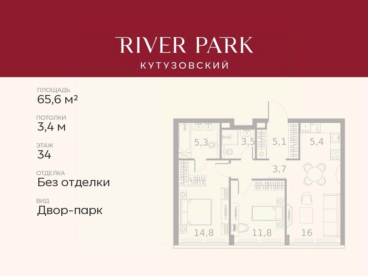 Продается 2-к квартира площадью 65.6 кв.м. на 34-м этаже в жилом комплексе премиум-класса River Park Кутузовский в Башне Amber Tower