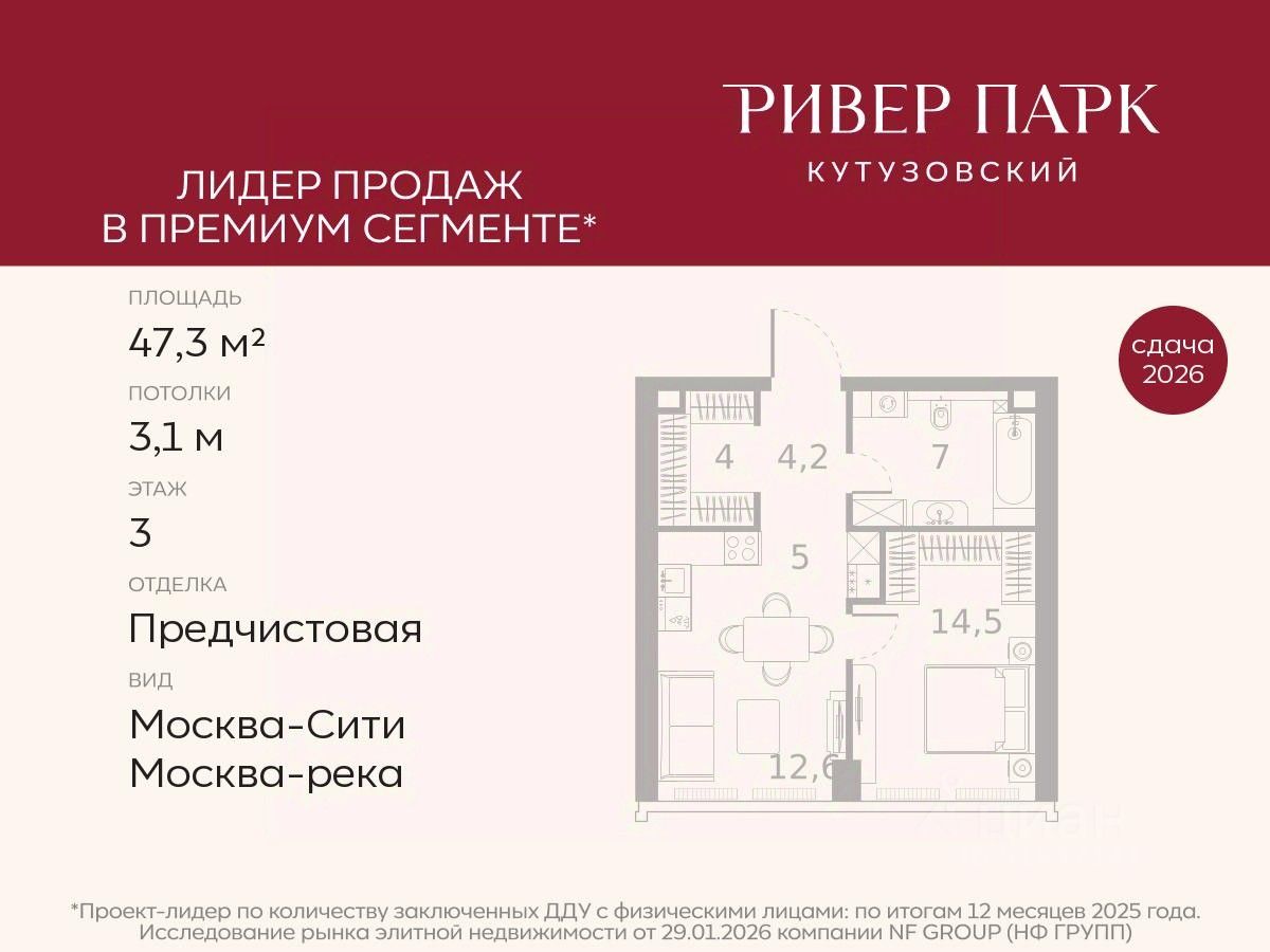 Продается 1-к квартира площадью 47.3 кв.м. на 3-м этаже в жилом комплексе премиум-класса Ривер Парк Кутузовский в Башне Изумруд