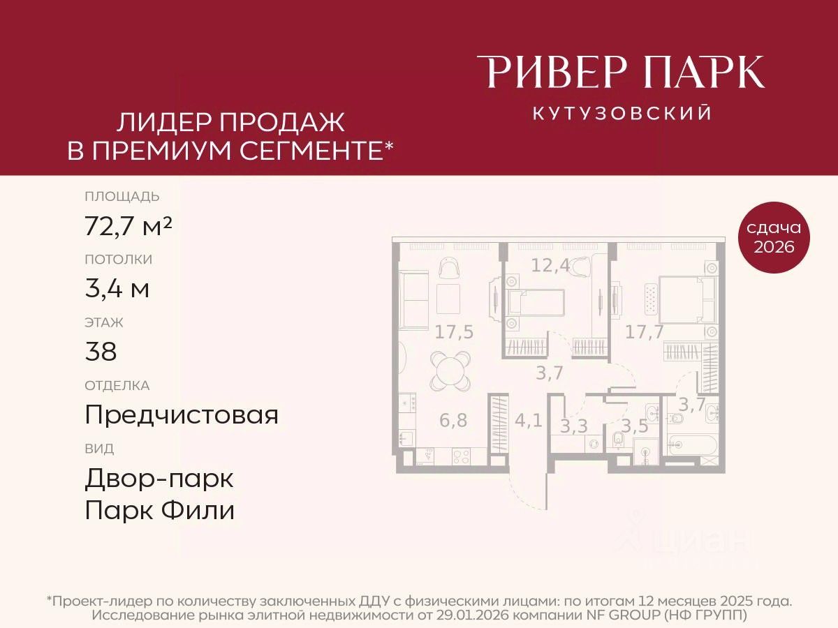 Продается 2-к квартира площадью 72.7 кв.м. на 38-м этаже в жилом комплексе премиум-класса Ривер Парк Кутузовский в Башне Изумруд