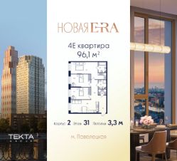 4-комн. квартира в ЖК "Era" на 31 этаже в 33 этажном здании Корпус 2. Общая площадь: 96.1 кв.м., жилая: 64.80 кв.м. Высота потолков 3.30 м.