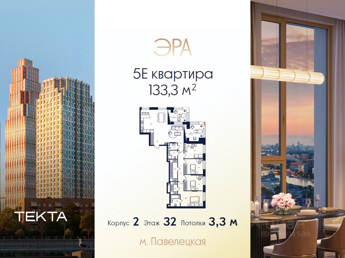 5-комн. квартира в ЖК "ЭРА" на 32 этаже в 33 этажном здании Корпус 2. Общая площадь: 133.3 кв.м., жилая: 89.80 кв.м. Высота потолков 3.30 м.