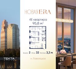4-комн. квартира в ЖК "Era" на 32 этаже в 33 этажном здании Корпус 2. Общая площадь: 95.8 кв.м., жилая: 64.80 кв.м. Высота потолков 3.30 м.