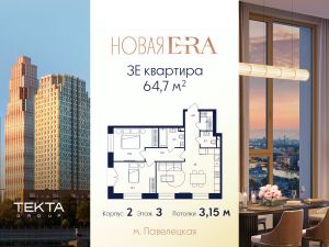3-комн. квартира в ЖК "Era" на 3 этаже в 33 этажном здании Корпус 2. Общая площадь: 64.7 кв.м., жилая: 38.20 кв.м. Высота потолков 3.15 м.