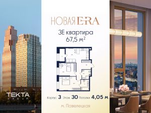 3-комн. квартира в ЖК "Era" на 30 этаже в 33 этажном здании Корпус 3. Общая площадь: 67.5 кв.м., жилая: 37.50 кв.м. Высота потолков 4.05 м.