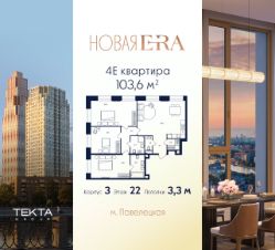 4-комн. квартира в ЖК "Era" на 22 этаже в 33 этажном здании Корпус 3. Общая площадь: 103.6 кв.м., жилая: 63.20 кв.м. Высота потолков 3.30 м.