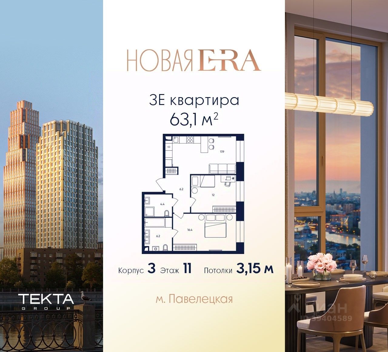 3-комн. квартира в ЖК "Era" на 11 этаже в 33 этажном здании Корпус 3. Общая площадь: 63.1 кв.м., жилая: 39.80 кв.м. Высота потолков 3.15 м.