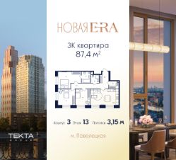 3-комн. квартира в ЖК "Era" на 13 этаже в 33 этажном здании Корпус 3. Общая площадь: 87.4 кв.м., жилая: 40.10 кв.м. Высота потолков 3.15 м.
