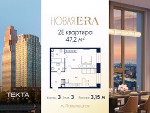 2-комн. квартира в ЖК "Era" на 3 этаже в 33 этажном здании Корпус 3. Общая площадь: 47.2 кв.м., жилая: 27.90 кв.м. Высота потолков 3.15 м.