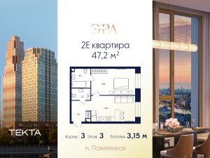 2-комн. квартира в ЖК "ЭРА" на 3 этаже в 33 этажном здании Корпус 3. Общая площадь: 47.2 кв.м., жилая: 27.90 кв.м. Высота потолков 3.15 м.