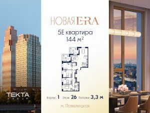 5-комн. квартира в ЖК "Era" на 26 этаже в 27 этажном здании Корпус 1. Общая площадь: 144 кв.м., жилая: 97.50 кв.м. Высота потолков 3.30 м.