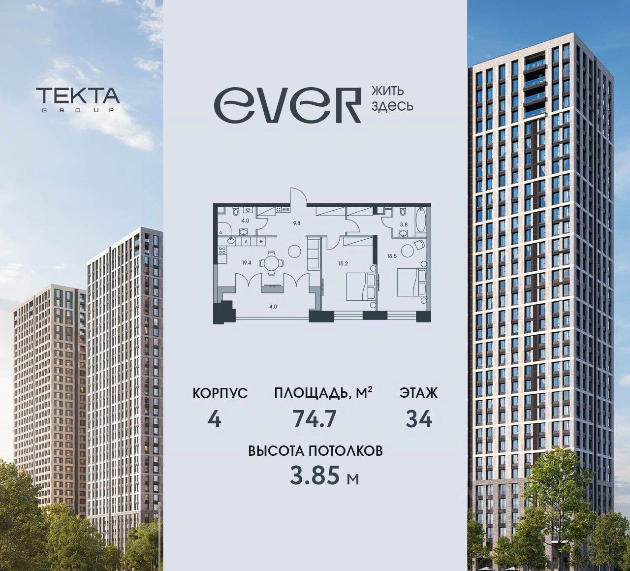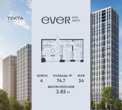 3-комн. квартира в ЖК "Ever" на 34 этаже в 34 этажном здании Корпус 4. Общая площадь: 74.7 кв.м., жилая: 45.7 кв.м. Высота потолков 3.85 м.