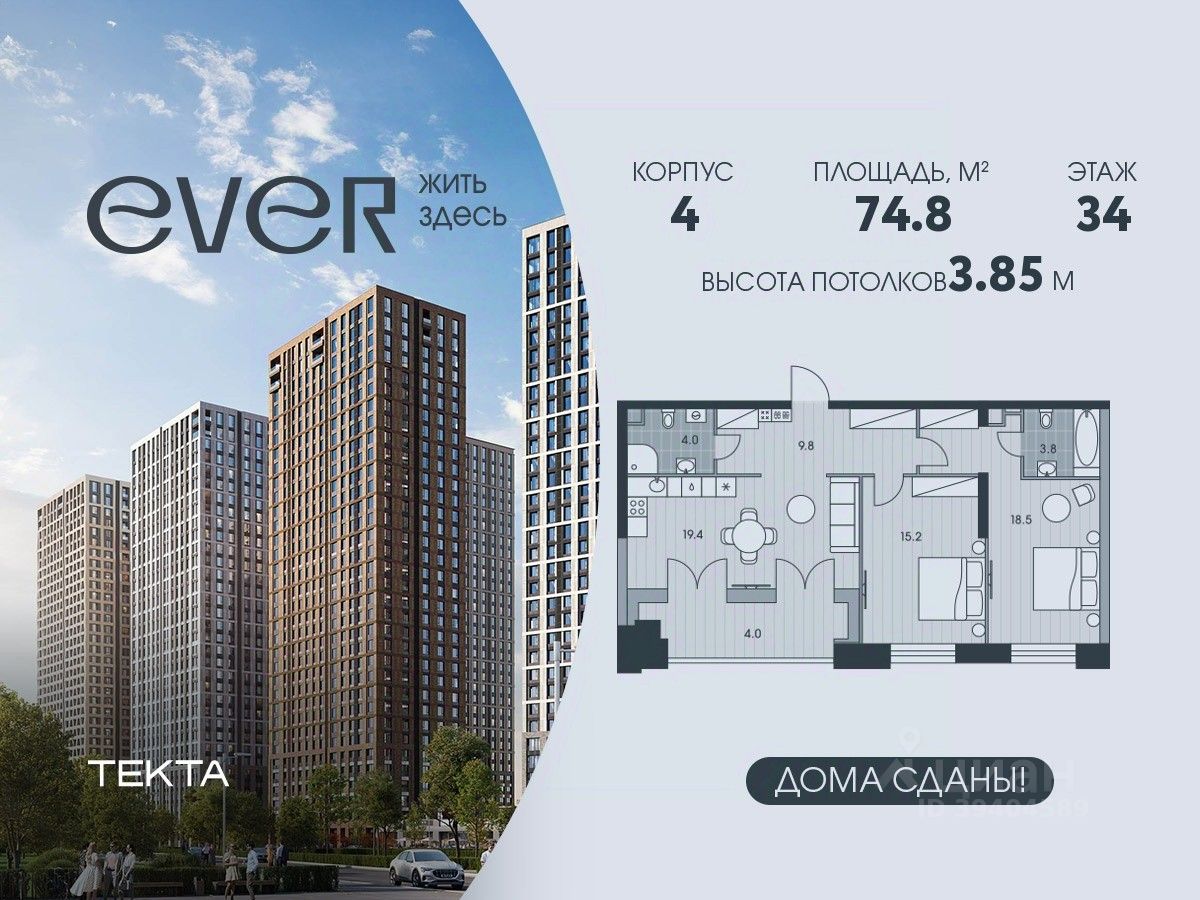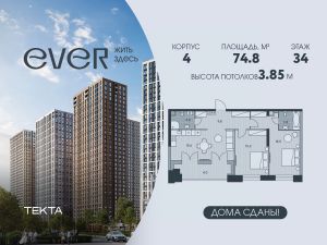 3-комн. квартира в ЖК "Ever" на 34 этаже в 34 этажном здании Корпус 4. Общая площадь: 74.8 кв.м., жилая: 45.7 кв.м. Высота потолков 3.85 м.