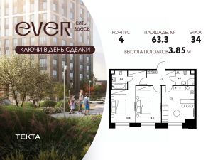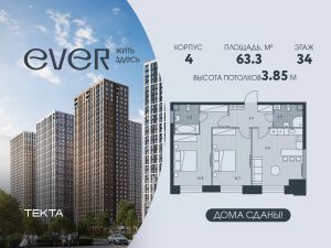 3-комн. квартира в ЖК "Ever" на 34 этаже в 34 этажном здании Корпус 4. Общая площадь: 63.3 кв.м., жилая: 40.1 кв.м. Высота потолков 3.85 м.