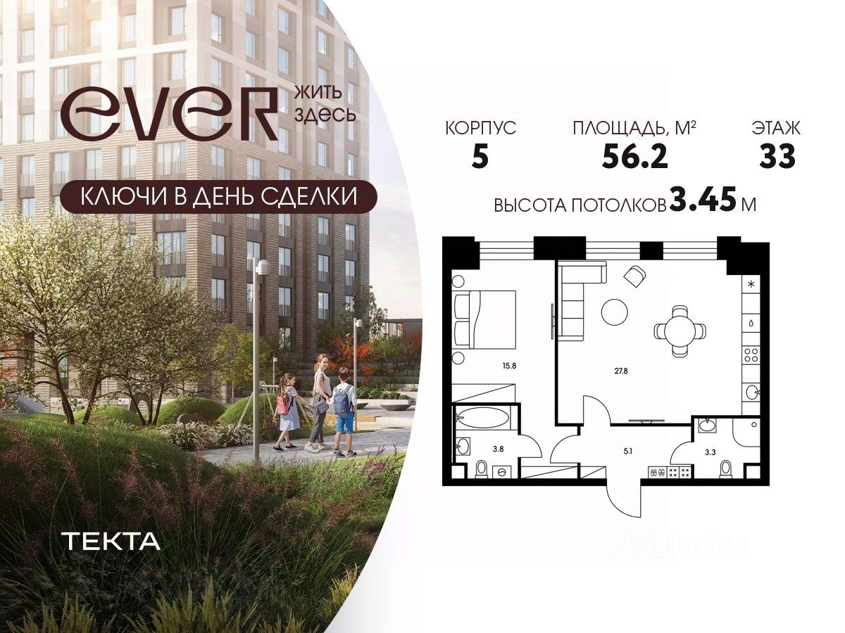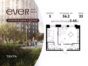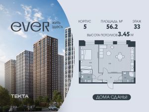 2-комн. квартира в ЖК "Ever" на 33 этаже в 34 этажном здании Корпус 5. Общая площадь: 56.2 кв.м., жилая: 35.2 кв.м. Высота потолков 3.45 м.