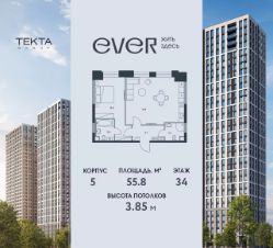 2-комн. квартира в ЖК "Ever" на 34 этаже в 34 этажном здании Корпус 5. Общая площадь: 55.8 кв.м., жилая: 35.2 кв.м. Высота потолков 3.85 м.